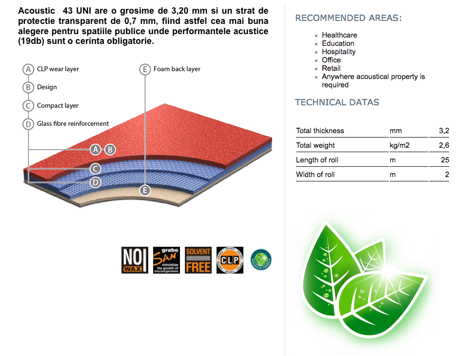 Acoustic 43 UNI are o grosime de 3,20 mm si un strat de protectie transparent de 0,7 mm, fiind astfel cea mai buna alegere pentru spatiile publice unde performantele acustice (19db) sunt o cerinta obligatorie.